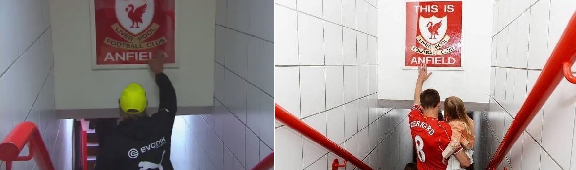 Na última vez que esteve em Anfield, ainda no Borussia Dortmund, Klopp fez o mesmo gesto que Gerrard, grande ídolo dos Reds, fez em sua despedida.