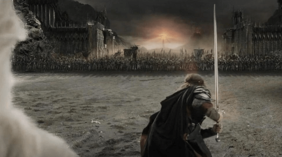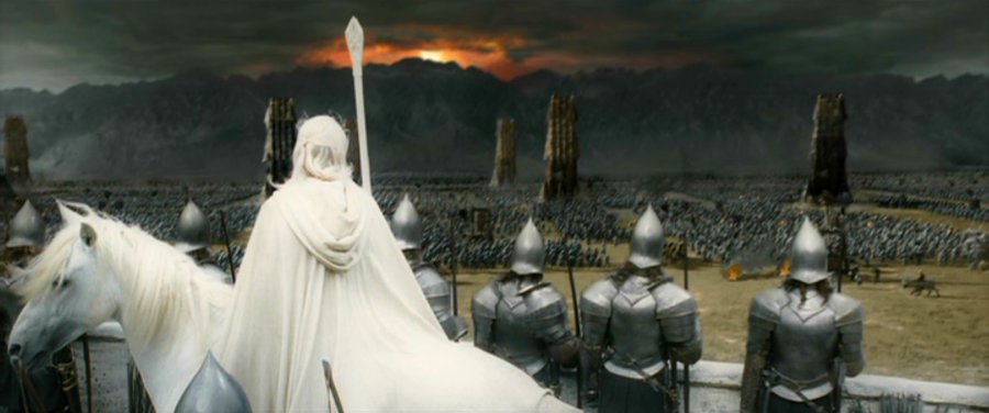 Talvez o maior discurso de um líder (ou rei) para o seu exército já exibido nos cinemas. Aragorn, já a vontade no papel ao qual estave destinado, assume seu lugar de fato como herdeiro de Isildor e marcha para o portões de Mordor com o exército dos homens. Mesmo perante o lugar onde eles não pareciam ter chances, e com o imenso Olho de Sauron totalmente voltado para ele e seu exército, Aragorn profere o épico discurso que resumidamente nos ensina a não deixar de lutar hoje só porque algum dia tudo pode piorar. Um discurso que derruba o niilismo no corações de todos os homens e os chamam para o cumprimento do dever e das responsabilidades. Simplesmente memorável!