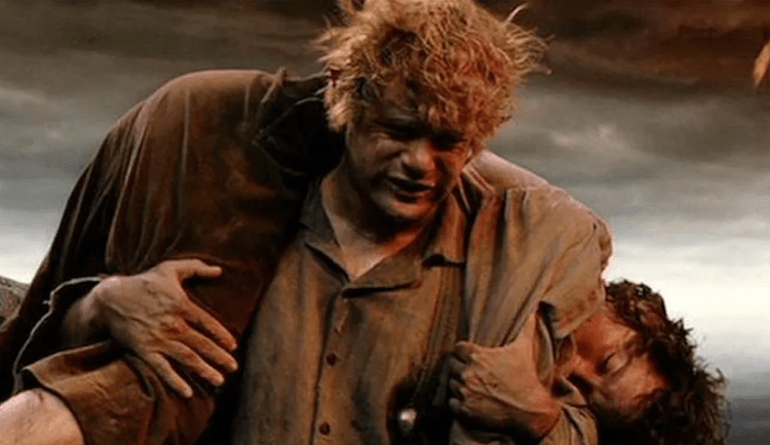 Poucas cenas tem tanto poder quanto a que mostra Sanwise Gamgee, exausto, buscar forças sabe-se lá de onde para carregar Frodo até o destino final na Montanha da Perdição. Como descrevi aqui, Sam é o maior personagem de toda a obra justamente por mostrar uma lealdade inabalável. Vê-lo se superar bravamente para ajudar Frodo a cumprir sua tarefa, depois de tudo o que ele já passara em sua longa jornada, é de encher os olhos de qualquer um. É impossível ver essa cena e não guardá-la, com carinho, para sempre.