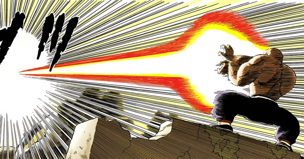 O Kamehameha visto pela primeira vez, pelas mãos do inventor do golpe mais famoso da história dos mangás. Essa é uma cena memorável por si só. Com o Kamehameha, o Mestre Kame apagou não somente o fogo da Montanha Frypan como fez sumir toda a montanha!